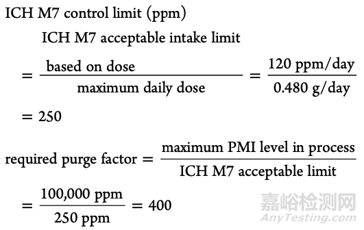 與所有清除方法一樣,API中的控制限制和所需的清除因子首先根據(jù)雜質(zhì)的可接受攝入量、藥物劑量、ICH M7的治療持續(xù)時間以及該過程產(chǎn)生的最大PMI水平來定義: