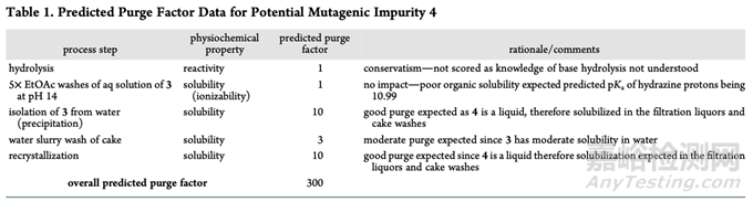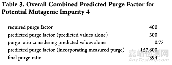 結(jié)合測量的清除量,對所需和預(yù)測的清除系數(shù)的比較表明,如表3所述,聯(lián)合預(yù)測清除量明顯大于所需清除量。根據(jù)綜合清除系數(shù),如果4在反應(yīng)結(jié)束時以高達(dá)10%的最大勢水平存在,則預(yù)測雜質(zhì)水平不會大于0.63 ppm,這是基于TTC的250 ppm可接受限值的0.25%。根據(jù)包含測量的清除系數(shù)的清除計算,4的水平不會超過相關(guān)的TTC,并且不需要將PMI 4的測試包含在與ICH M7選項4控制策略一致的藥物物質(zhì)規(guī)范中。