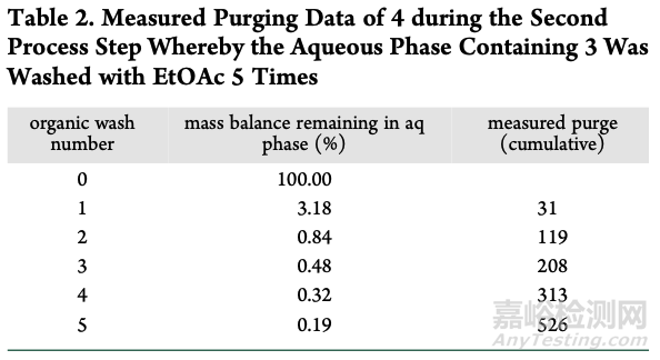 在生產(chǎn)API 3的最后一步中,醇試劑1以1.1摩爾當(dāng)量與苯酚2的當(dāng)量加入;因此,10%(100,000 ppm)被用作最壞情況的起始濃度4,用于清除評估。通過對清除的專家評估,表明沒有足夠的能力來確保4的濃度水平將被清除至低于可接受限度(表1)。在進(jìn)一步評估預(yù)測因素后,根據(jù)pKa和水相pH值的原理,由于有機(jī)溶解度差,沒有考慮有機(jī)溶劑中4的洗滌。由于沒有可用的溶解度數(shù)據(jù),通過使用HPLC測定的含量數(shù)據(jù)作為單元操作中4的清除系數(shù)(表2),在不到1天內(nèi)收集了支持?jǐn)?shù)據(jù)。