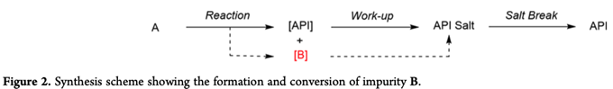 雜質(zhì)B是一種ICH M7 2類(Ames陽性)化合物,在合成過程的最后一個化學(xué)鍵形成步驟中形成。在反應(yīng)過程中形成后,雜質(zhì)B在水處理過程中轉(zhuǎn)化為API(圖2)。