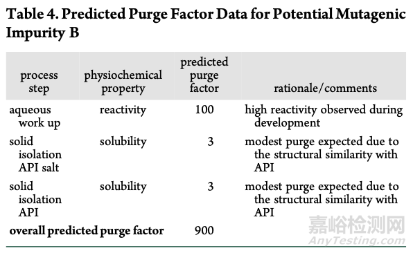 為了確定適當(dāng)?shù)目刂撇呗?,使用Teasdale框架的預(yù)測清除系數(shù)被計算為100,000,包括第3階段的反應(yīng)性為100和第4階段的反應(yīng)性為10;以及兩個固定分離的兩個10因子,考慮到B在第3階段和第4階段的分離溶劑混合物中的已知高溶解度。保守地認(rèn)為,由于第2階段分離期間已知的有限清除,起始水平與IPC驗收標(biāo)準(zhǔn)相同。因此,原料藥的預(yù)測水平為0.02/100,000 = 0.2 ppm。