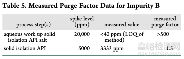 為了證實預(yù)測,進(jìn)行了兩項添加-清除研究(表5)。首先,最高水平的雜質(zhì)B在整個設(shè)計空間中,反應(yīng)期間觀察到的(2%)被帶入研究,在分離的API鹽中測量的雜質(zhì)B水平小于40ppm[分析方法的定量極限(LOQ)],代表測量的清除系數(shù)至少為500。其次,雜質(zhì)B以0.5%的水平被添加到API鹽中,并測量了每個DoE實驗的清除系數(shù)。在整個設(shè)計空間中,測量的清除系數(shù)始終為1.5。因此,綜合測量的清除系數(shù)被確定為至少500×1.5=750,這導(dǎo)致API中最壞情況的預(yù)測水平為27ppm。應(yīng)該注意的是,測試到的清除系數(shù)可能更高,因為清除實驗結(jié)果被測量為分析方法的LOQ,這意味著樣品中實際存在的值小于此值。如果使用更敏感的分析方法,就會建立更大的清除系數(shù)。