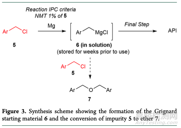 在生產(chǎn)最后階段格里納德反應(yīng)的API(圖3)過程中,用于起始物料Grignard 6合成的原料苯基氯化物5被確定為2類(Ames陽性)化合物。氯化芐基5被轉(zhuǎn)化為原料藥,但起始原料6中存在的未反應(yīng)5預(yù)計不會在最后一步發(fā)生反應(yīng)。在生產(chǎn)起始物料6階段,通過反應(yīng)完成過程檢查(IPC)將5的存在限制在NMT 1%。
