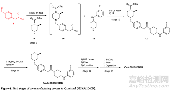生產(chǎn)過程的最后階段涉及芐基溴化物8與過量(1.1摩爾當(dāng)量)哌嗪9反應(yīng),產(chǎn)生羧酸10,羧酸10轉(zhuǎn)化為酰胺12。如圖4所述,以下酸介導(dǎo)的boc-deprotect揭示了Camicinal(GSK962040B)。