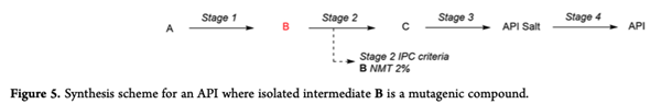 第1階段分離的中間體B是ICH M7第2類(Ames陽性)化合物。在其形成的下游,B在第2至第4階段轉(zhuǎn)化為原料藥,并被第2階段反應(yīng)完成IPC限制在NMT 2%(圖5)。