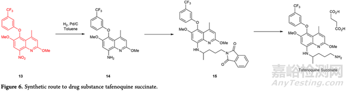 硝基喹哌13是合成抗瘧疾藥物物質(zhì)琥珀酸他非喹的中間體,也是14中的潛在雜質(zhì),如圖6所示。硝基喹嘧嘧喹13是一種ICH M7第2類突變原,在中間體14中經(jīng)常被該過程控制在1.15%以下?;赥TC的可接受限值是琥珀酸他非喹的400ppm,因此,13所需的清除量是中間體14中的29。