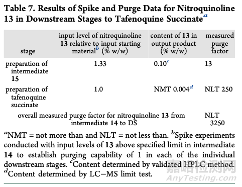 為了評估13存在于API中的風(fēng)險,進(jìn)行了添加-清除研究,以確定13在中間14的下游化學(xué)中的命運。這些研究表明,13不會反應(yīng),而是在分離液中凈化,測量的總體凈化系數(shù)不低于3250,詳見表7?;谶@些測量的清除因素,如果中間14中13以1.15%的w/w存在,則琥珀酸他非喹中的13水平不會超過3.5ppm,相當(dāng)于基于TTC的可接受限值的0.9%的NMT。