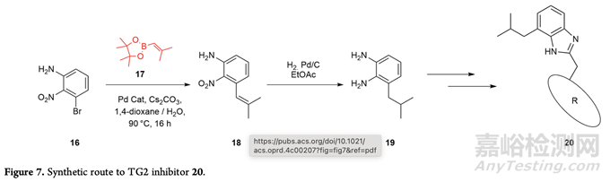 圖7顯示了可用于治療腹瀉的TG2抑制劑20的合成途徑。合成涉及烷基硼酸酯17,這是一種ICH M7 3類化合物。作為遺傳毒性雜質(zhì)風(fēng)險評估過程的一部分,對下游化學(xué)中硼酸酯17的清除進(jìn)行了評估。使用17的輸入水平作為起始濃度,在沒有額外數(shù)據(jù)的情況下,預(yù)測到所需清除率不足以證明選項4的控制是合理的。盡管在16到18的預(yù)期轉(zhuǎn)換中已知17的反應(yīng)性,預(yù)測18至19的還原性,以及通過溶解度在19至20之間的分離期間預(yù)測清除。因此,根據(jù)Barber等人描述的框架,尋求補充其他信息來補充這一預(yù)測的清除。