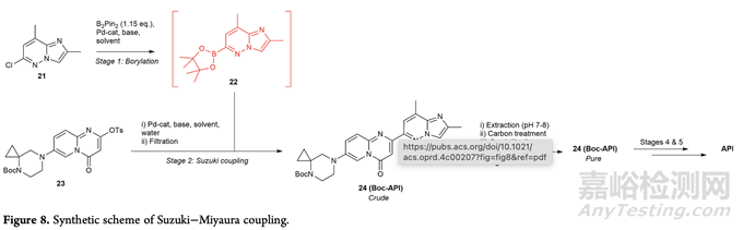 在鈴木-宮浦偶聯(lián)反應(yīng)(連投第1和第2階段)中,B2Pin2用于形成硼酯22(第1階段產(chǎn)物),直接用作第2階段的溶液,以產(chǎn)生粗偶聯(lián)產(chǎn)物24(圖8)。然后對粗耦合產(chǎn)物進(jìn)行純化和分離,然后是API的另外兩個階段。