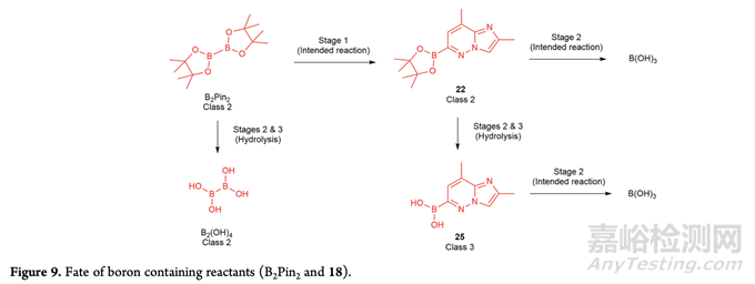 在第1階段和第2階段,發(fā)現(xiàn)了四種含有誘變性和潛在誘變性雜質(zhì)的硼,即B2Pin2、ArBPin 22、B2(OH)4和ArB(OH)2 25(圖9)。