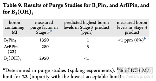 •第3階段的峰值和清除量用于清除率最低的兩種雜質(zhì)B2Pin2和22,以及B2(OH)4。由于其內(nèi)在的化學(xué)不穩(wěn)定性,無法對25進(jìn)行清除研究。測量的清除系數(shù)能夠計算第3階段產(chǎn)品中可達(dá)到的最高硼水平,使用第2階段產(chǎn)品在開發(fā)期間測量的最高硼水平(1400 ppm)作為輸入。預(yù)測的第3階段產(chǎn)品中的硼含量遠(yuǎn)遠(yuǎn)低于可接受的限值(表9)。