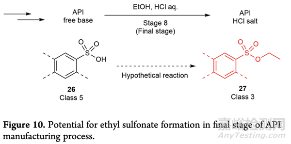 化合物26是一種芳基磺酸雜質(zhì),在階段8底物(API游離堿)和最終API(HCl鹽)中被控制為特定雜質(zhì),其接受標(biāo)準(zhǔn)設(shè)定為1毫克每日總攝入量(ICH Q3A識別/資格閾值)。考慮到第8階段(HCl鹽的形成和結(jié)晶)中使用的工藝條件,這些工藝條件在加熱下同時使用乙醇和鹽酸,假設(shè)27(26的乙基磺酸酯)可能會在生產(chǎn)過程中的這一階段形成(圖10)。此外,由于乙醇可以作為殘留溶劑(根據(jù)ICH Q3C控制)存在于API中,因此還假設(shè)在儲存過程中可能會形成乙基磺酸酯。