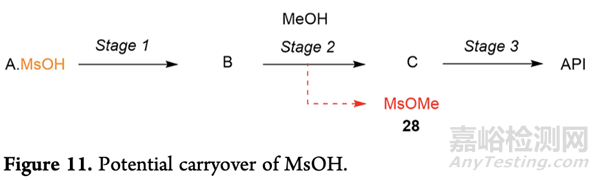 甲硫酸甲酯28是一種遺傳毒性雜質(zhì),當(dāng)使用中間體A(胺的甲烷磺酸鹽)時,在第2階段通過殘留的甲硫酸和甲醇反應(yīng)。在整個開發(fā)和圖11中。通過開發(fā)和商業(yè)化生產(chǎn),作為藥物質(zhì)量標(biāo)準(zhǔn)的一部分,對藥物物質(zhì)中28的含量進(jìn)行了測試(接受標(biāo)準(zhǔn):<5 ppm)。所有批次的API測量水平始終低于5ppm。