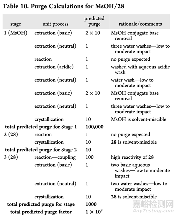 為了簡化生產(chǎn),要求在批準(zhǔn)后取消測試要求。過程控制確保超過可接受限額的28人的風(fēng)險可以忽略不計(ICH M7,選項4)。隨后進(jìn)行了清除評估,以評估MsOH(表10,第1階段)和28(表10,第2階段和第3)的清除量。