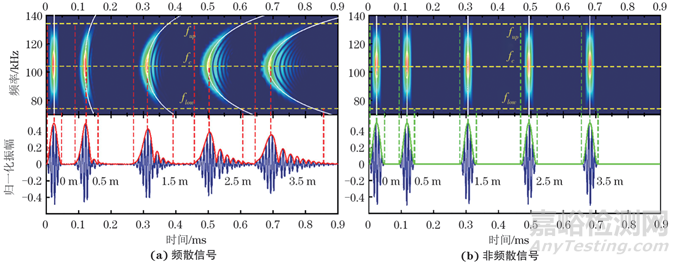 圖1 頻域和時(shí)域中的頻散信號(hào)與非頻散信號(hào)的傳播示意