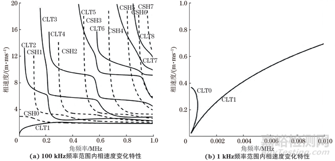 圖2 周向?qū)Рǖ南嗨俣阮l散曲線:CLT為周向蘭姆類(厚度)模態(tài)波,CHS為周向水平剪切模態(tài)波,其中導(dǎo)波數(shù)字代表模態(tài)波的階數(shù)