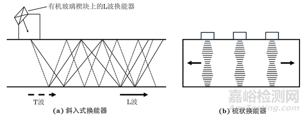 斜入式換能器通過有機(jī)玻璃楔塊來激勵(lì)導(dǎo)波,其中楔塊使得L波以一定角度入射到板結(jié)構(gòu)中。梳狀換能器由一系列排列成梳齒狀的壓電元件組成,能夠產(chǎn)生相位同步的導(dǎo)波。