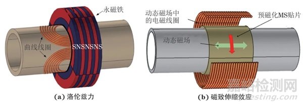 電磁聲換能器(EMAT)的工作原理主要是通過洛倫茲力和磁致伸縮效應(yīng)激發(fā)和接收超聲導(dǎo)波,如圖10所示。
