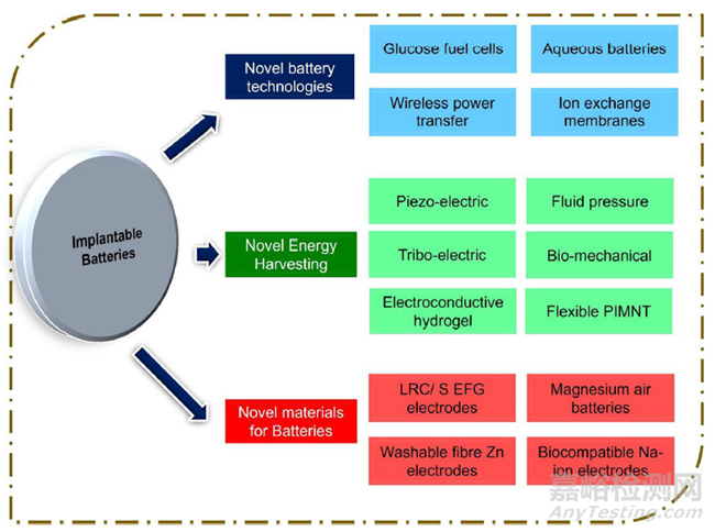 在設(shè)計IMD電池時,需要解決的主要挑戰(zhàn)包括設(shè)備的壽命、尺寸小型化、所用材料的生物相容性以及設(shè)備商業(yè)化的安全法規(guī)。所有這些挑戰(zhàn)為研究與開發(fā)帶來了大量機會。植入式電池發(fā)展的一個重要限制是其自身固有的,即電池技術(shù)發(fā)展緩慢。然而,材料和納米科學的最新發(fā)展通過探索新的生物相容性電解質(zhì)、電極以及縮小植入式設(shè)備尺寸,在一定程度上解決了這一挑戰(zhàn)。其中提出了利用新型納米材料、仿生能量收集技術(shù)和無線充電功能來探索不同的電池技術(shù),以此作為傳統(tǒng)電池的替代品。此外,葡萄糖燃料電池等替代能源的開發(fā)也有助于推進植入式電池技術(shù)。延長電池壽命需要調(diào)整電池參數(shù),因此在電池性能研究過程中對新型電極和電解質(zhì)材料的使用進行了探索。
