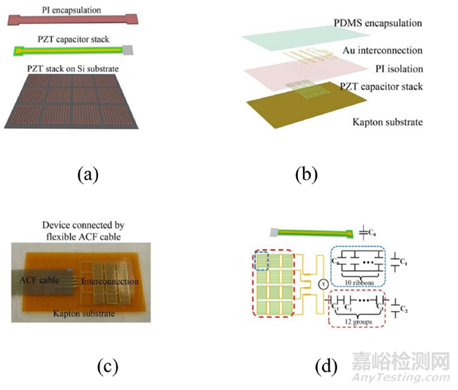 a 壓電電容器,PI封裝堆疊在硅襯底上 b 各層互連 c 帶柔性電纜的裝置 d 等效電路