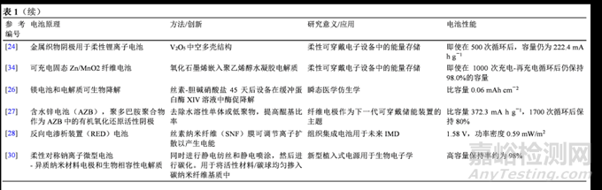 使用光學顯微鏡對含有殼聚糖膽堿硝酸鹽CS-[Ch][NO3]聚合物電解質(zhì)膜的集成固態(tài)電池進行了表征,結(jié)果表明,以1:1的重量比向殼聚糖中添加[Ch][NO3]可顯著提高電解質(zhì)膜的離子電導率(7.3 × 10–4 S cm−1),而純殼聚糖膜的離子電導率低于10–8 S cm−1 。絲素膽堿硝酸鹽(SF-[Ch][NO3](1:3))復合電解質(zhì)的離子電導率為3.4 mS cm−1,在電流密度為10 μA cm−2時,電池容量為0.06 mAh cm−2?;跉ぞ厶呛徒z素電解質(zhì)的電池具有良好的生物降解性,因此被推薦用于為短時瞬時生物醫(yī)學植入物供電,便于輸送藥物和監(jiān)測再生組織。經(jīng)證明,Zn/MnO2設(shè)計的可再充電固態(tài)纖維電池具有91 Wh·L−1的體積能量密度,即使在1000次充電-再充電循環(huán)后仍能保持98%的容量。表1總結(jié)了植入式電池的研究進展。