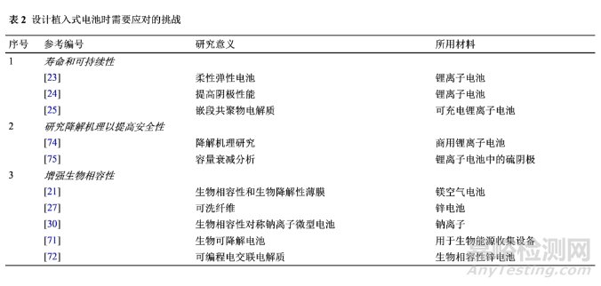 除了壽命之外,生物相容性和安全性因素還要求開發(fā)和使用新型可生物降解材料,因此對生物可降解性增強材料的使用進行了探索。鎂離子、鋅離子和鈉離子電池構(gòu)成可生物降解組,而鋅離子、鋰離子、生物燃料等電池構(gòu)成不可降解電池組,有望推動未來的電池技術(shù)發(fā)展。建議對電池進行專門測試以研究其降解特性,作為一項提高安全性的措施。特別推薦無線充電技術(shù)來有效應(yīng)對這些挑戰(zhàn)。因此,本文詳細討論了當前電池技術(shù)所帶來的局限性,并提出了提高IMD供電電池質(zhì)量的解決方案。表2總結(jié)了植入式電池的設(shè)計挑戰(zhàn)。由新型材料制成的電池如圖4所示。
