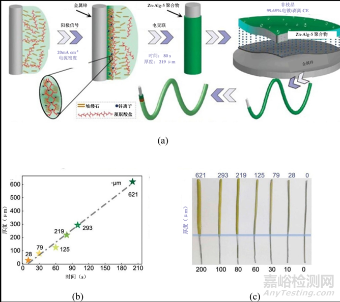 圖4 植入式電池新型材料的示例 - 綠色可編程海藻酸鋅聚合物電解質(zhì)(轉(zhuǎn)載自[72]。經(jīng)Creative Commons CC By許可,http://creativecommons.org/licenses/by/4.0/)。a Zn-Alg-5電解質(zhì)分步制備。b 電交聯(lián)時間與聚合物厚度的變化 c 鋅電交聯(lián)在不同時間間隔的照片