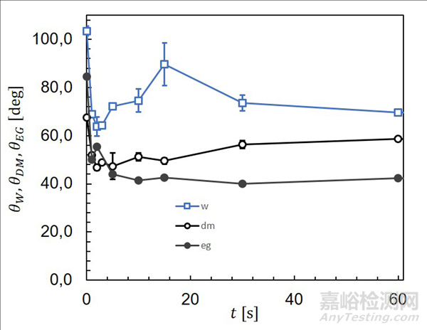 在圖2中顯示了每種探測液體的平均接觸角隨等離子處理時間的變化。在開始的幾秒接觸角有個猛烈的降低到了64°,但水的接觸角在15秒后增加到了最大值。二碘甲烷的接觸角也在處理時間4秒后慢慢增加,而乙二醇的接觸角則在整個處理時間段基本保持不變。