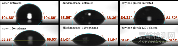 圖3 探測液體的液滴圖(水,二碘甲烷和乙二醇),在未處理和等離子處理120s后的聚丙烯表面