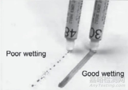 為達到良好的黏接,吸附理論有兩個條件滿足。一是黏接劑要能很好的潤濕被黏物表面;液體黏接劑向被黏表面擴散,逐漸潤濕被黏物表面并滲入表面微孔中,由點接觸變成面接觸。二是黏接劑與被黏物之間有較強的相互作用力;產(chǎn)生吸附作用形成次價鍵或主價鍵。從圖1中看出,表面張力大,潤濕能力差,表面張力小,潤濕能力好。聚合物是表面張力小容易浸潤黏合界面附著力好,表面張力大會讓膠水呈蠟滴狀圓球不擴散。