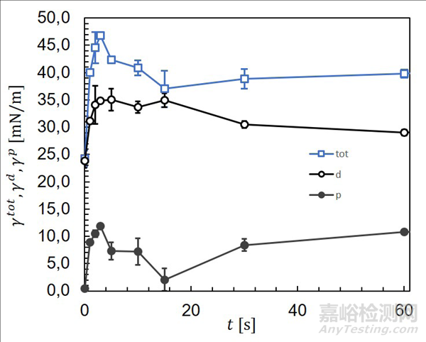 通過圖3中的接觸角,用OWRK方法確定聚丙烯的表面自由能(γtot)。總表面自由能,即極性和色散表面自由能與等離子處理時間的關(guān)系在圖3中。開始時γtot=24.2 mJ/m2但在處理3秒后增加到46.8 mJ/m2。表面自由能在15秒時降到最低值,而隨后升高到大約40 mJ/m2。