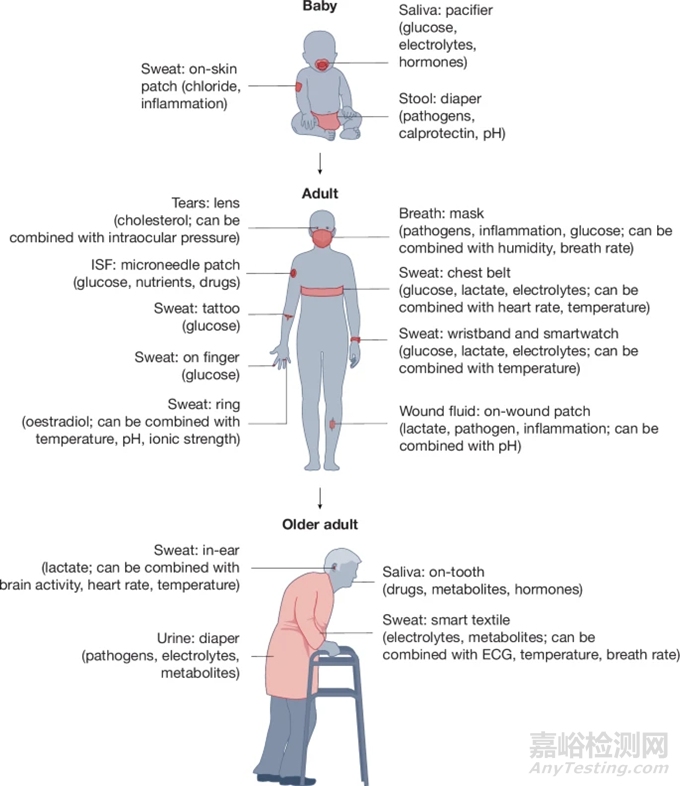 圖2 目前用于人類生命周期背景下各種體液的可穿戴傳感設(shè)備 (圖源:Nature)