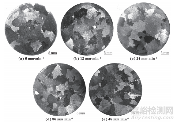 圖6 不同抽拉速度下IN718高溫合金試樣中部的晶粒形貌(模殼溫度 1290 ℃)