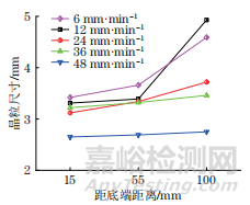 圖7 不同抽拉速度下IN718高溫合金試樣的晶粒尺寸隨距底端距離的變化曲線(模殼溫度1290 ℃)