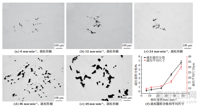 圖8 不同抽拉速度下IN718高溫合金試樣中部的疏松形貌及疏松面積分?jǐn)?shù)和平均尺寸隨抽拉速度的變化曲線(模殼溫度 1290 ℃)