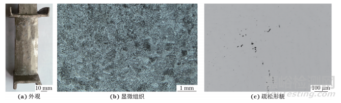 圖9 優(yōu)化新型熱控凝固工藝下結(jié)構(gòu)件的外觀、中部顯微組織和疏松形貌