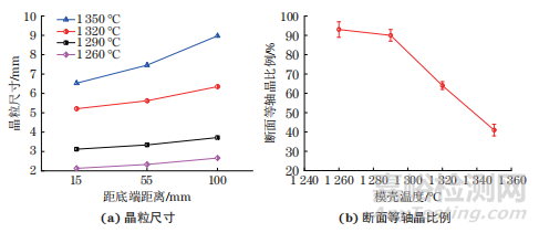 圖4 不同模殼溫度下IN718高溫合金試樣的晶粒尺寸隨距底端距離的變化曲線以及斷面等軸晶比例(抽拉速度24mm·min-1)