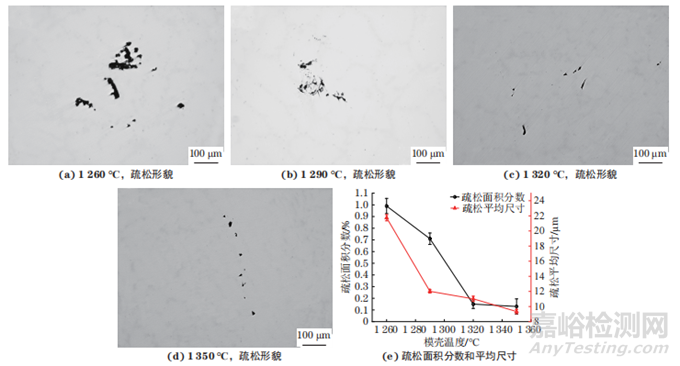 由圖5可見,當(dāng)模殼溫度為1260℃時,試樣中部疏松含量最多,尺寸較大且呈聚集分布。這主要是由于此時剩余液相構(gòu)成的毛細(xì)管通道封閉,且枝晶間的剩余液相較少,沒有充足的液體補縮。隨著模殼溫度的升高,疏松分散分布且面積分?jǐn)?shù)從0.99%減少到0.13%,平均尺寸由21.75μm減小到9.34μm。在熱控凝固過程中當(dāng)模殼溫度高于固相線時,枝晶間有足夠的剩余液體通過連通的毛細(xì)管通道進(jìn)行補縮;同時模殼溫度的升高使得枝晶間剩余液相增多,且枝晶搭接后的毛細(xì)管通道保持暢通。這有利于減少疏松含量。
