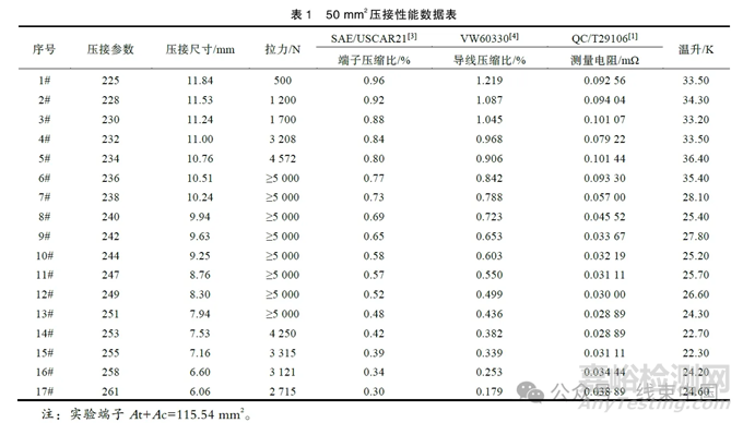 (7)六邊形壓接端子適用的端子壓縮比分析。首先無論何種情況壓接處的截面積不可小于標稱導(dǎo)體截面積;其次由于每種高壓端子的材料厚度選擇上會有差異,根據(jù)端子壓縮比=100T/(At+Ac),有些端子的At 截面積較低,壓縮后過低的端子壓縮比會導(dǎo)致壓接處截面積小于標稱導(dǎo)體截面積。因此壓接后截面積需要盡可能要大一些。另外從拉力數(shù)據(jù)中分析過低的壓縮比會導(dǎo)致端子的機械拉力數(shù)值下降,影響端子壓接的可靠性。