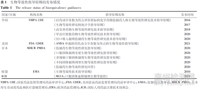 2013年,DAVIT等比較了各監(jiān)管機構的生物等效性指導原則,包括美國、加拿大、歐盟、中國、日本、韓國、新加坡、澳大利亞等,詳細比較了仿制藥和參比制劑定義、試驗設計、藥代動力學參數(shù)計算及等效標準、高變異藥物、窄治療指數(shù)藥物等方面的內容,結果表明,各監(jiān)管機構指導原則存在諸多差異。隨后的時間,為了促進仿制藥國際互認,惠及全世界人民,各監(jiān)管機構通過國際協(xié)調組織的平臺進行溝通交流,分別做出努力。近年來,中國、美國、日本及ICH的生物等效性指導原則均有更新,本文匯總了最新指導原則情況,見表1。