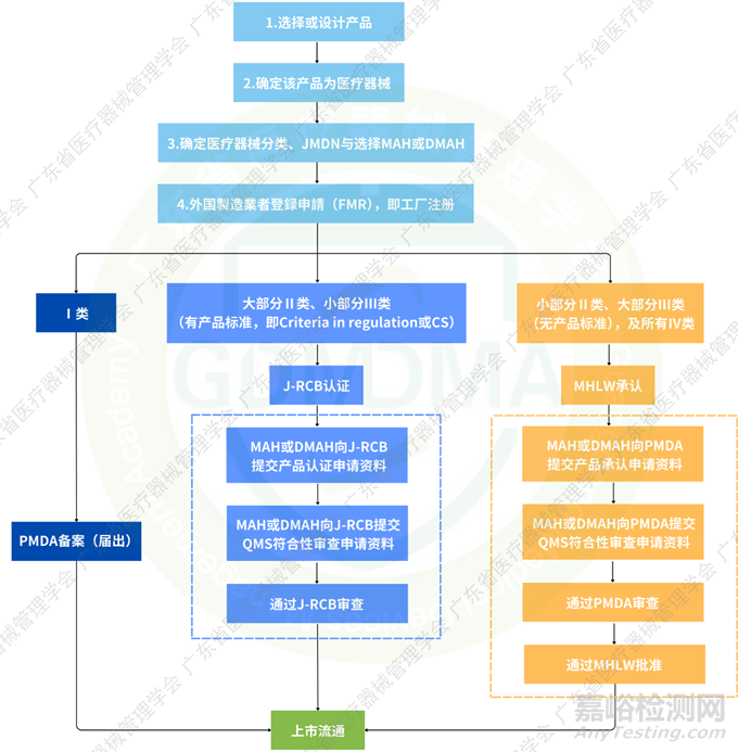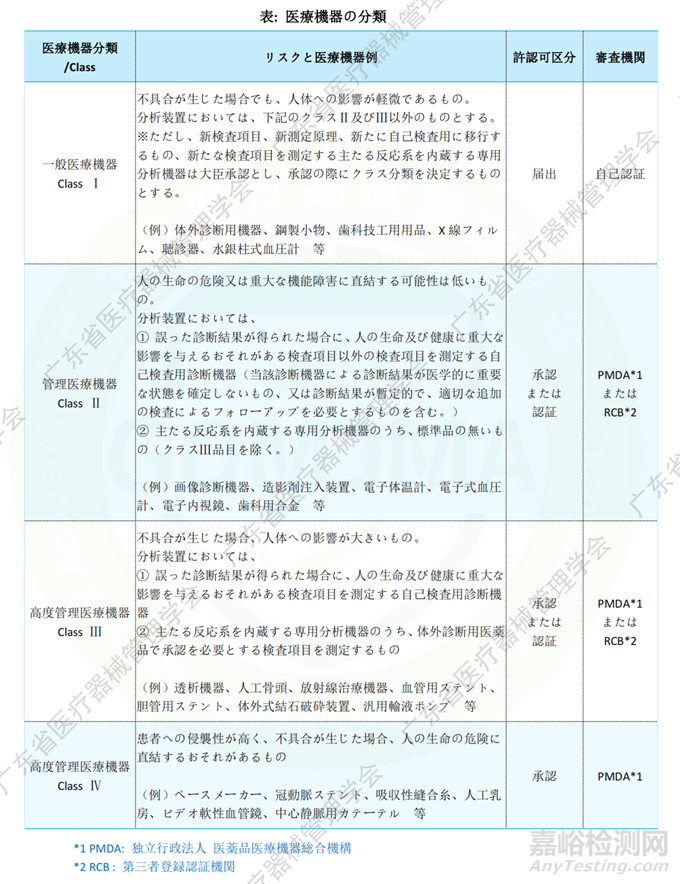 醫(yī)療器械根據(jù)其對(duì)人類造成的危險(xiǎn)程度進(jìn)行分類,分為一般醫(yī)療器械(Class I)、管理醫(yī)療器械(Class II)和高度管理醫(yī)療器械(Class III, IV)。醫(yī)療器械分類不同,其符合性路徑不同;即Class I僅需向PMDA備案(屆出),大部分Class II及小部分Class III(有產(chǎn)品標(biāo)準(zhǔn))需提交J-RCB(日本第三方公告機(jī)構(gòu))認(rèn)證,而小部分Class II、大部分Class III及所有Class IV需經(jīng)PMDA審核后MHLW承認(rèn)。