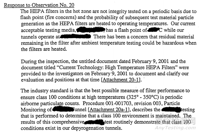在檢查期間,已向檢查員提供了某無標題文件和題為《現(xiàn)行技術:高溫HEPA過濾器》的文件以描述和說明當時的立場和評估。