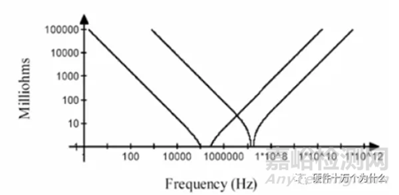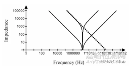 實(shí)際的電容存在寄生電感與等效串聯(lián)電阻。由于單個(gè)電容的ESR、ESL相近,他們的阻抗特性也是相近的,單個(gè)電容與多個(gè)特性相同的電容并聯(lián)阻抗特性圖