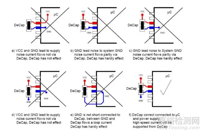 由于高頻信號的波長很短,因此小電容需要在盡可能短的距離內(nèi)提供去耦作用,否則信號會(huì)在電路中傳播較遠(yuǎn),導(dǎo)致去耦電容的效果降低。