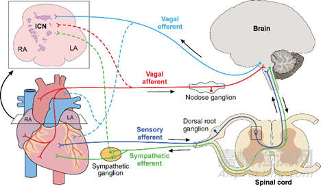 Vagal afferent(迷走神經(jīng)傳入纖維):從心臟出發(fā),經(jīng)過結(jié)狀神經(jīng)節(jié)(Nodose ganglion),將心臟的感覺信息傳遞到大腦。