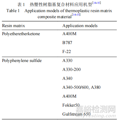 與熱固性樹(shù)脂基復(fù)合材料相比,熱塑性樹(shù)脂基復(fù)合材料具有抗沖擊性能好、可循環(huán)使用、可修補(bǔ)、可焊接、預(yù)浸料可無(wú)限期室溫儲(chǔ)存等特點(diǎn),目前主要應(yīng)用于各類艙門(mén)和機(jī)翼前緣等需要抗頻繁沖擊風(fēng)險(xiǎn)的結(jié)構(gòu),并逐步推廣應(yīng)用到飛機(jī)整流罩、升降舵、平尾、公務(wù)機(jī)機(jī)翼、垂尾等大型結(jié)構(gòu)制件上。目前在航空結(jié)構(gòu)應(yīng)用的熱塑性復(fù)合材料主要以聚醚醚酮和聚苯硫醚系列為主,表1列出了其主要應(yīng)用機(jī)型。