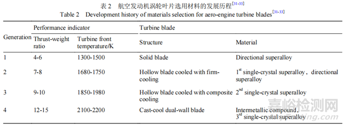 隨著制造工藝的創(chuàng)新,鑄造高溫合金由等軸晶、定向鑄晶發(fā)展到單晶,通過(guò)一步步消除晶界使鑄造高溫合金承溫能力逐漸提高。作為航空發(fā)動(dòng)機(jī)葉片的主要材料,鑄造高溫合金的發(fā)展也成就了航空發(fā)動(dòng)機(jī)推重比的不斷提高,表2列出了各代航空發(fā)動(dòng)機(jī)渦輪葉片選用材料的發(fā)展歷程。隨著對(duì)高溫合金性能要求的不斷提高,合金的成分設(shè)計(jì)空間變得越來(lái)越小,基于材料計(jì)算、高通量實(shí)驗(yàn)、機(jī)器學(xué)習(xí)等手段開(kāi)展合金成分設(shè)計(jì)成為未來(lái)的發(fā)展趨勢(shì),通過(guò)模擬仿真優(yōu)化工藝參數(shù)已經(jīng)逐漸成為通用的高溫合金零部件生產(chǎn)制備方法。