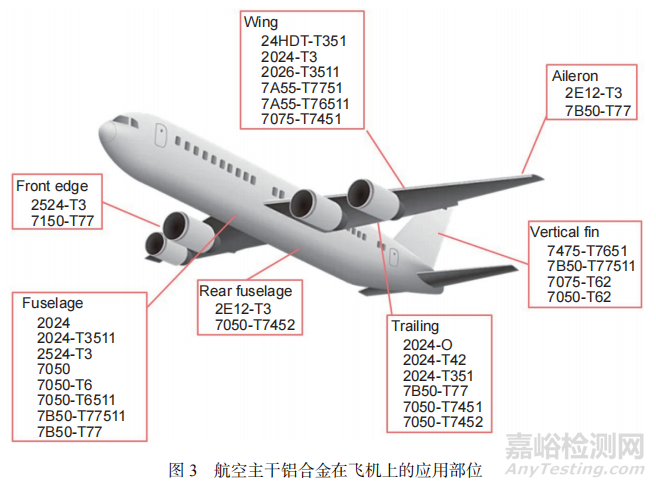 航空方面,鋁合金主要用于飛機(jī)機(jī)身、機(jī)翼、尾翼的主承力框、梁、壁板、接頭及蒙皮等部位,圖3展示了鋁合金在飛機(jī)上各部件的應(yīng)用情況;航天方面,大型運(yùn)載火箭貯箱、艙段主結(jié)構(gòu)、連接及過(guò)渡環(huán)等主承力部位采用了大量的先進(jìn)鋁合金。隨著計(jì)算材料學(xué)技術(shù)的進(jìn)步,第一性原理、熱力學(xué)計(jì)算、動(dòng)力學(xué)計(jì)算等方法逐漸應(yīng)用到航空鋁合金的成分設(shè)計(jì)中,并逐漸轉(zhuǎn)向采用機(jī)器學(xué)習(xí)的方法預(yù)測(cè)組織演變規(guī)律、相穩(wěn)定性及綜合性能等。例如,通過(guò)計(jì)算機(jī)輔助模擬計(jì)算和實(shí)驗(yàn)驗(yàn)證相結(jié)合的方式,我國(guó)成功研發(fā)出800MPa級(jí)超高強(qiáng)鋁合金。