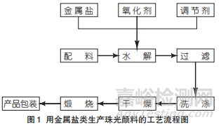 珠光顏料的生產(chǎn)工藝是由珠光顏料的種類不同而不同。現(xiàn)以金屬鹽為主要原料生產(chǎn)珠光顏料的工藝為例,描述它的工藝流程和簡(jiǎn)單的說明。其工藝流程見圖1