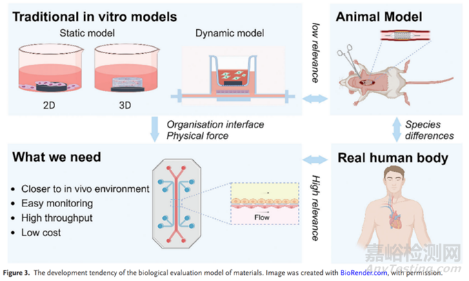 目前主要采用體外試驗(yàn)和動(dòng)物試驗(yàn)評(píng)估生物醫(yī)用材料的安全性和可行性。但體外試驗(yàn)和動(dòng)物試驗(yàn)存在局限性,動(dòng)物試驗(yàn)很難監(jiān)測(cè)可降解材料在體內(nèi)的降解行為,以及降解產(chǎn)物與組織的交互作用,此外,種屬差異和倫理問題也使得動(dòng)物模型具有逐漸被取代的趨勢(shì)。體外試驗(yàn)缺乏血液流動(dòng)和組織,無法真實(shí)地模擬體內(nèi)環(huán)境。因此,尋求一種更真實(shí)全面的體外生物學(xué)評(píng)價(jià)方法至關(guān)重要。